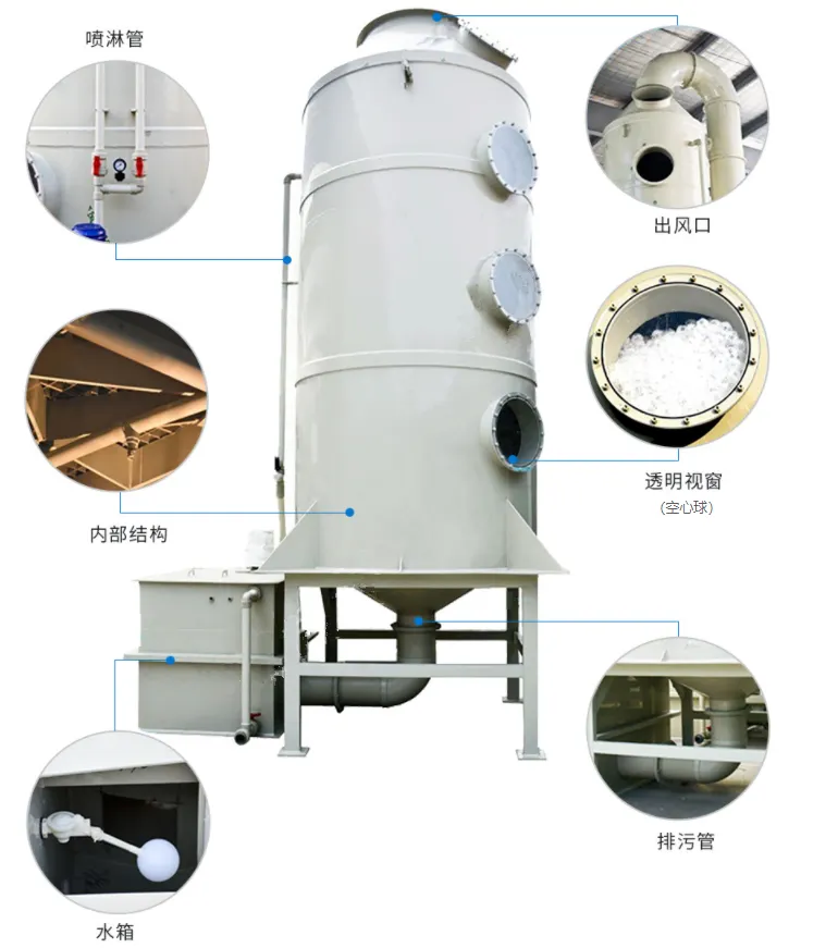 噴淋塔對各種腐蝕性氣體凈化處理效果明顯,能有效去除氯化氫氣體(HCl)、氟化氫氣體(HF)、氨氣(NH3)、硫酸霧(H2SO4)、鉻酸霧(CrO3)、氰氫酸氣體(HCN)、堿蒸氣(NaOH)、福爾馬林(HCHO)等水溶性氣體。噴淋塔廢氣凈化效率高、操作管理簡單、使用壽命長,凈化處理后的酸堿廢氣排放達(dá)到國家排放標(biāo)準(zhǔn)。