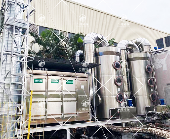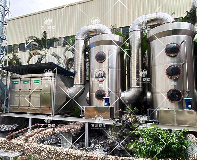 根據(jù)客戶需求和我司實(shí)地考察之后,最終采用‘兩級(jí)噴淋吸收法+活性炭吸附法’對(duì)其進(jìn)行處理。采用水噴淋一方面可以降溫,另一位方面能夠讓水吸收一部分的有機(jī)廢氣,降低后續(xù)活性炭吸附的負(fù)荷。